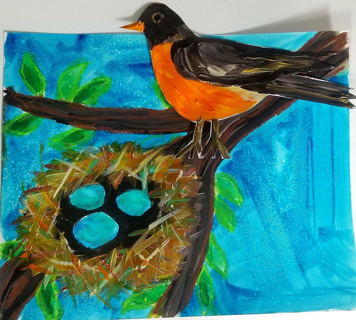 We have Robin's Nest bags...the robin is done with liquid watercolors, pastels and acrylics. There is a template for the robin or older kids can draw their own.Then create your own bird with Model Magic, feathers, and googly eyes. Cost is $18 which includes all materials and step by step directions!